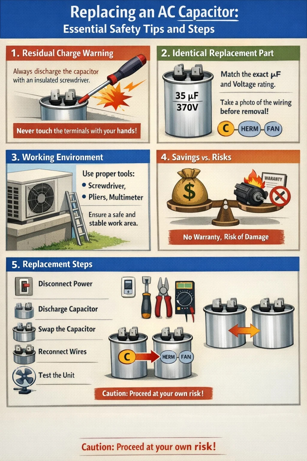 Garantie annulée : Si votre climatiseur est toujours sous garantie, le remplacement vous-même du condensateur CA peut annuler la garantie du fabricant.