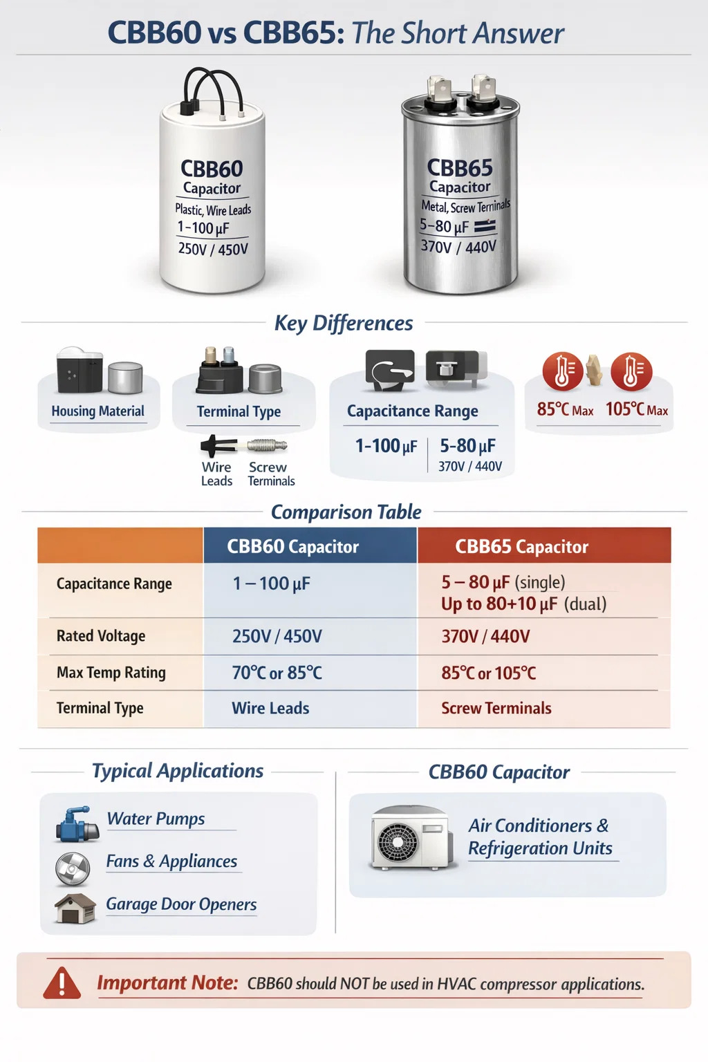 En bref : le CBB65 peut remplacer le CBB60 dans la plupart des applications, mais le CBB60 ne devrait pas remplacer le CBB65 dans les applications de compresseurs.
