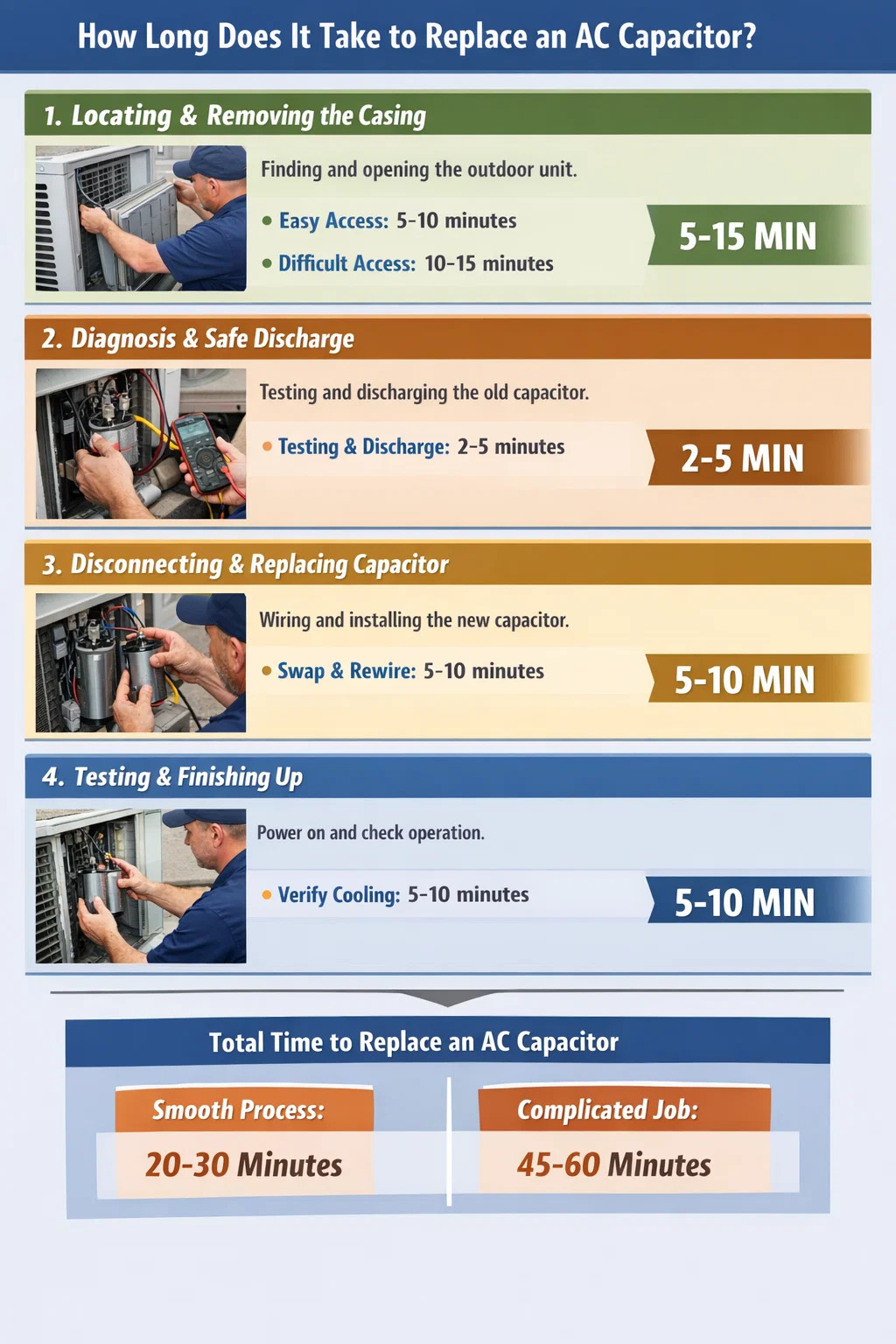 Combien de temps faut-il réellement pour remplacer un Condensateur CA ? Si vous ne regardez que les quelques minutes pendant lesquelles le technicien travaille, vous pourriez penser que le travail est étonnamment rapide. Mais à partir du moment où le technicien arrive jusqu'à ce que le climatiseur souffle à nouveau de l'air froid, tout un processus s'ensuit.