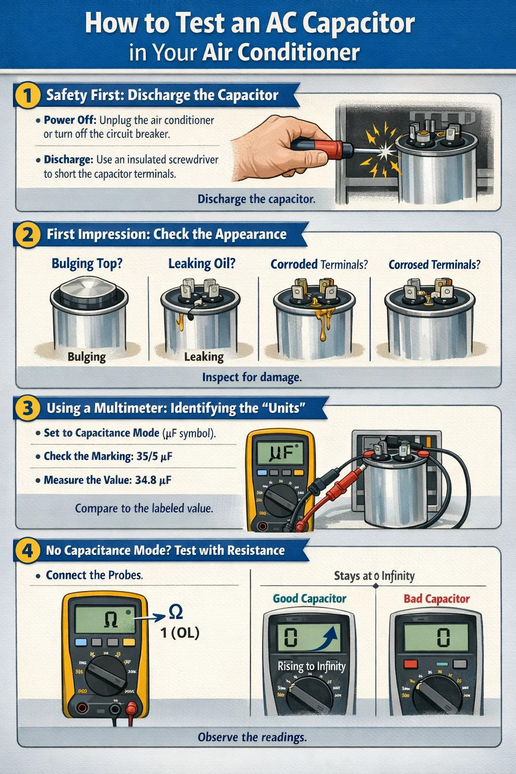 | Mauvais | La lecture est 0, proche de zéro, ou le compteur affiche « OL » (Open Loop). | Mort. Le condensateur est complètement tombé en panne. L'unité AC ne démarre pas ; remplacez-le immédiatement. |