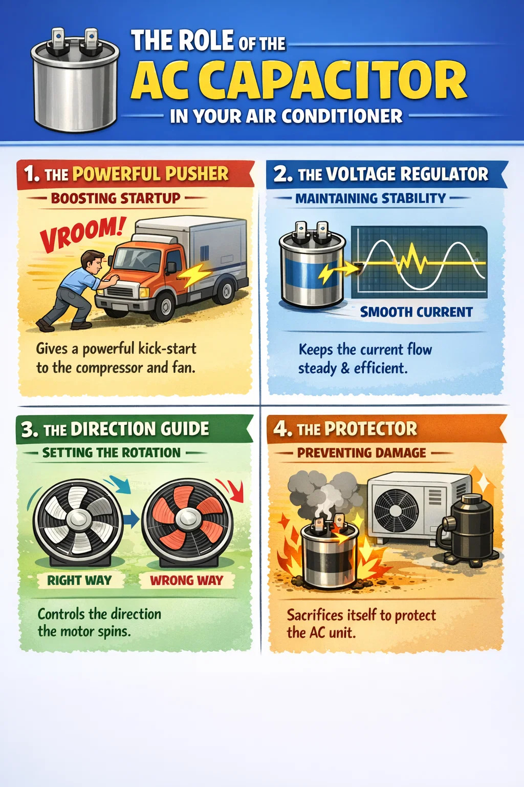 Le Condensateur CA (condensateur du climatiseur) est comme une « batterie de secours » ou un « booster » dans votre climatiseur. Même s'il est petit, il s'agit généralement d'une petite boîte en métal argenté, votre climatiseur ne pourrait pas fonctionner sans lui.