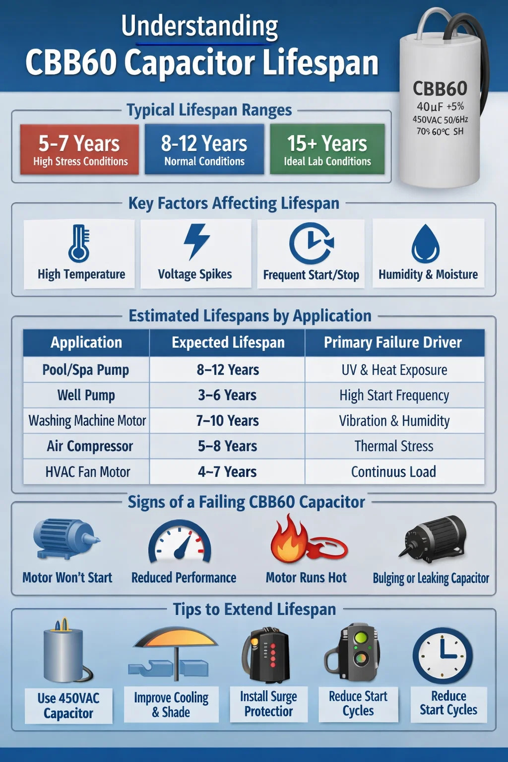 La durée de vie d'un condensateur CBB60 varie généralement de 8 à 12 ans dans des conditions de fonctionnement normales, bien que de nombreuses unités tombent en panne plus tôt (souvent dans les 5 à 7 ans) lorsqu'elles sont soumises à un stress thermique, à des pics de tension ou à des cycles de charge élevés et continus. Dans des conditions de laboratoire idéales avec une température et une tension nominale contrôlées, certains condensateurs CBB60 ont démontré une durée de vie opérationnelle supérieure à 15 ans. Cependant, les environnements d'installation réels répondent rarement à ces paramètres idéaux.